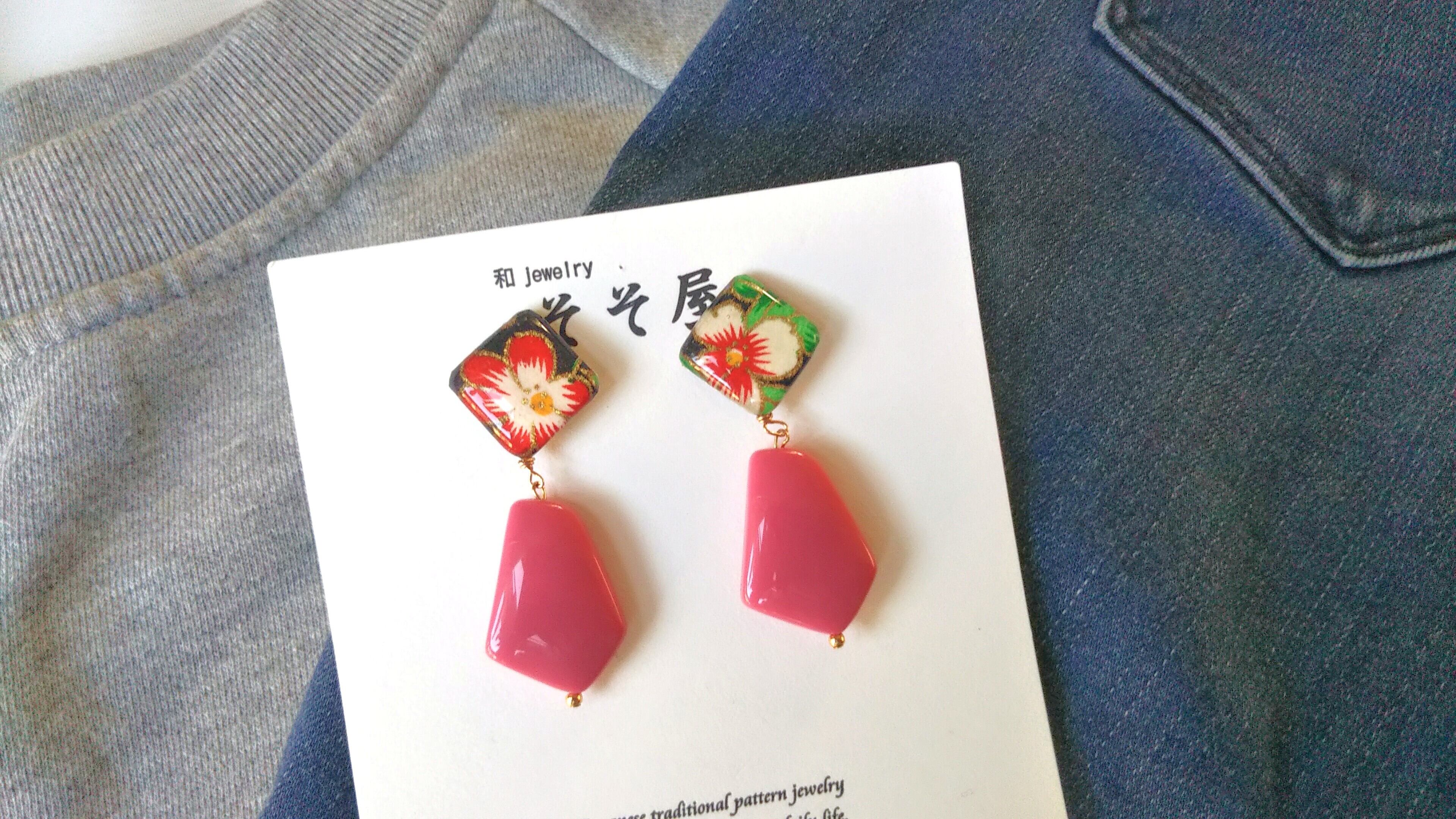 ◆イヤリング変更可◆友禅カラフルビーズピアス(ピンク)