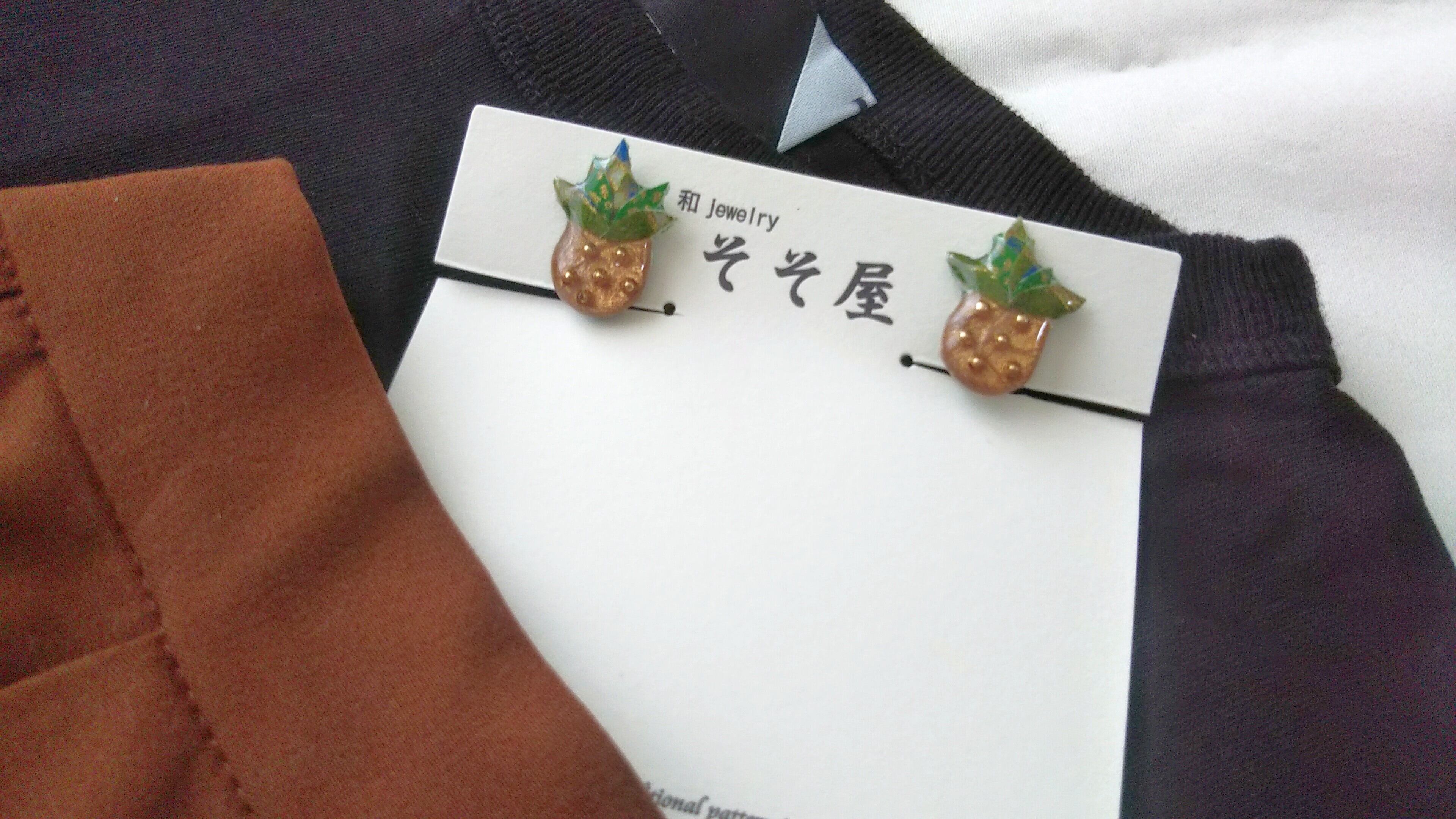 和柄でパイナップルのモチーフを製作した、 コロンと可愛らしいピアス(イヤリング)です。 マスク生活が日常となった今、ストレスフリーなサイズ感で且つ気分の上がるデザインに仕上げました。 14kgfのビーズがキラキラと輝きを増してくれます。 夏だけでなく、季節を問わずお付けいただきたい和ジュエリーです。 サイズ 全長約2cm 素材 14kgf金具、透明樹脂、14kgfビーズ